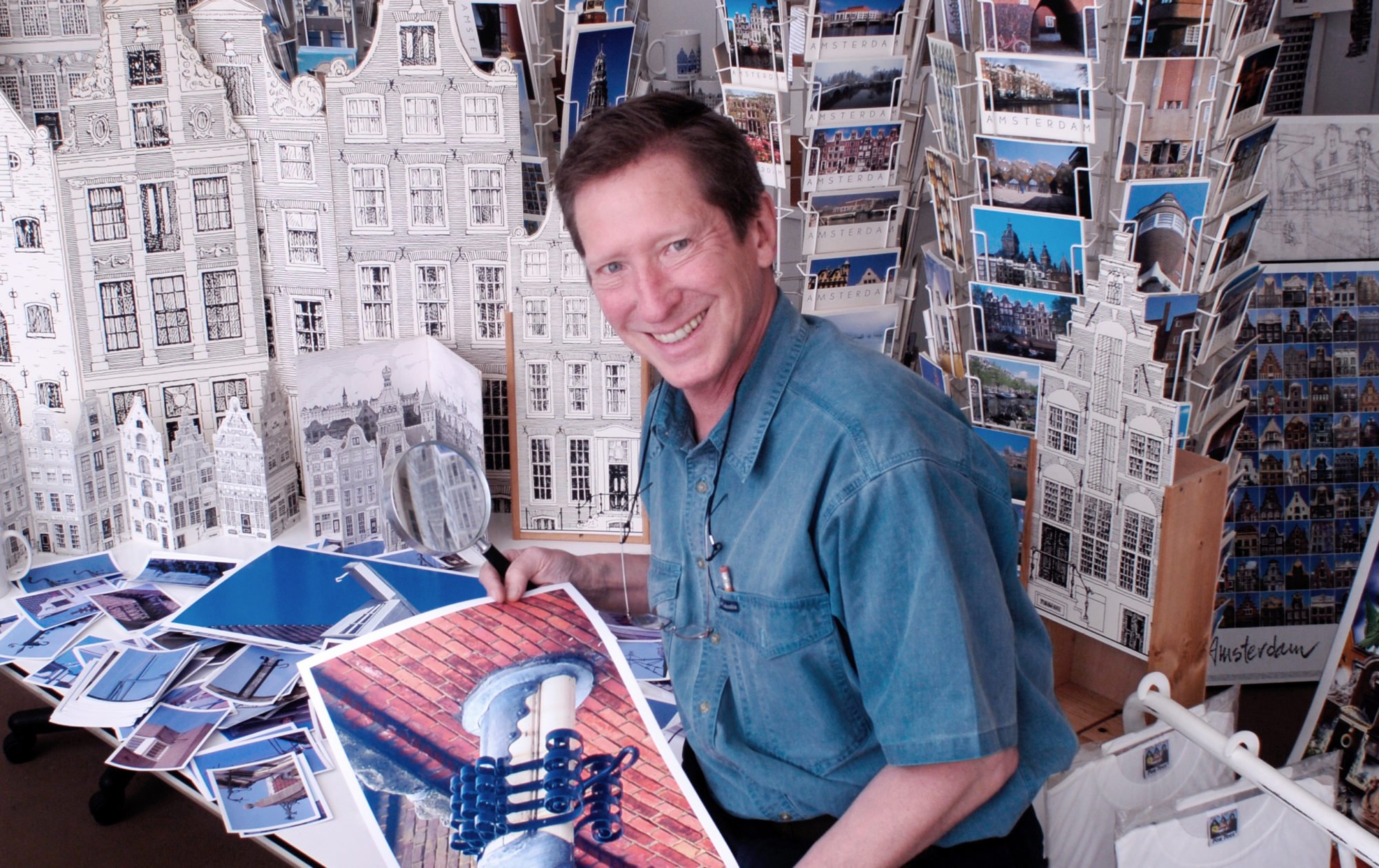 Amsterdam became his new home town and he would live there for the rest of his life. Soon after arriving in Amsterdam, Killiam made it his life’s work to document the facades of the buildings on Amsterdam’s seventeenth-century ring of canals in their current state, resulting in the Amsterdamse Grachtengids (original Dutch edition) and the Amsterdam Canal Guide (English version).