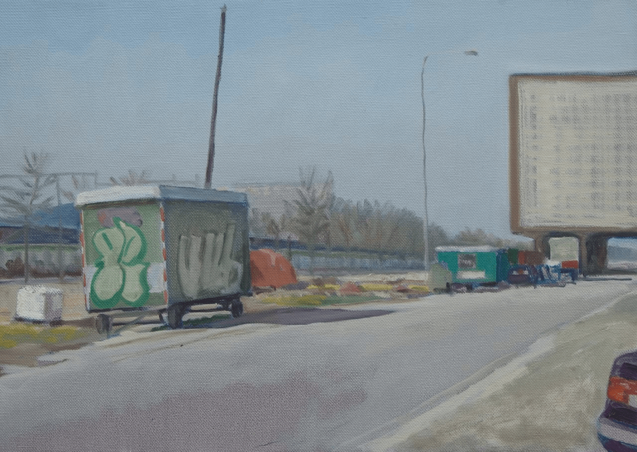 Schippers bezit van nature een genereus oog. Hij schildert alles wat hij ziet: een invalidekarretje, containers, logo’s op gebouwen; het mag er allemaal zijn. Pony’s op een stukje groen naast een enorme IKEA-doos, vrachtwagens die vreemd parkeergedrag vertonen, glasbakken, bushokjes en billboardreclames van auto’s zo groot als de geparkeerde auto’s ernaast.
